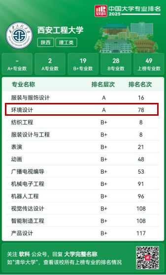 2025年6月18日,高等教育专业评价机构软科正式发布“2025软科中国大学专业排名”,覆盖836个专业,是迄今为止规模最大的中国大学本科专业排名。我校服装与服饰设计和环境设计两专业斩获A级,凸显了学校在设计学特色专业领域的实力。球王会体育环境设计专业凭借过硬的教育质量和鲜明特色,再次荣膺A级殊荣,这是继2021年获批陕西省一流专业建设点、2024年“‘丰图义仓’粮食储备库景观交互虚拟仿真实验”获评省级虚拟仿真实验教学一流课程后,再次取得的重大突破。