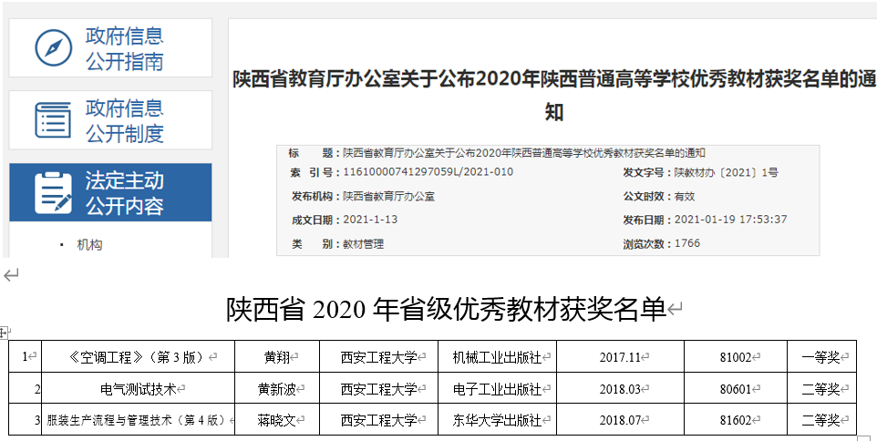 近日,陕西省教育厅印发《关于公布2020年陕西普通高等学校优秀教材获奖名单的通知》(陕教高办〔2021〕1号),球王会体育黄翔教授主编的《空调工程》(第3版)获得省级优秀教材一等奖。