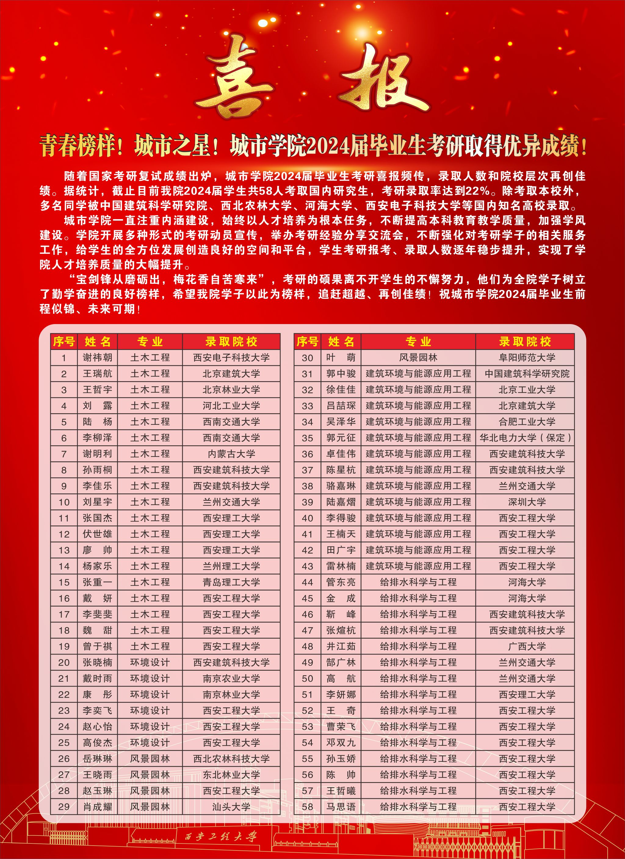 随着国家考研复试成绩出炉,城市学院2024届毕业生考研喜报频传,录取人数和院校层次再创佳绩。据统计,截止目前球王会官网2024届学生共58人考取国内研究生,考研录取率达到22%。除考取本校外,多名同学被中国建筑科学研究院、西北农林大学、河海大学、西安电子科技大学等国内知名高校录取。