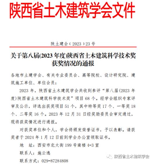 喜报!球王会官网土木教师荣获第八届(2023年度)陕西省土木建筑科学技术一等奖
