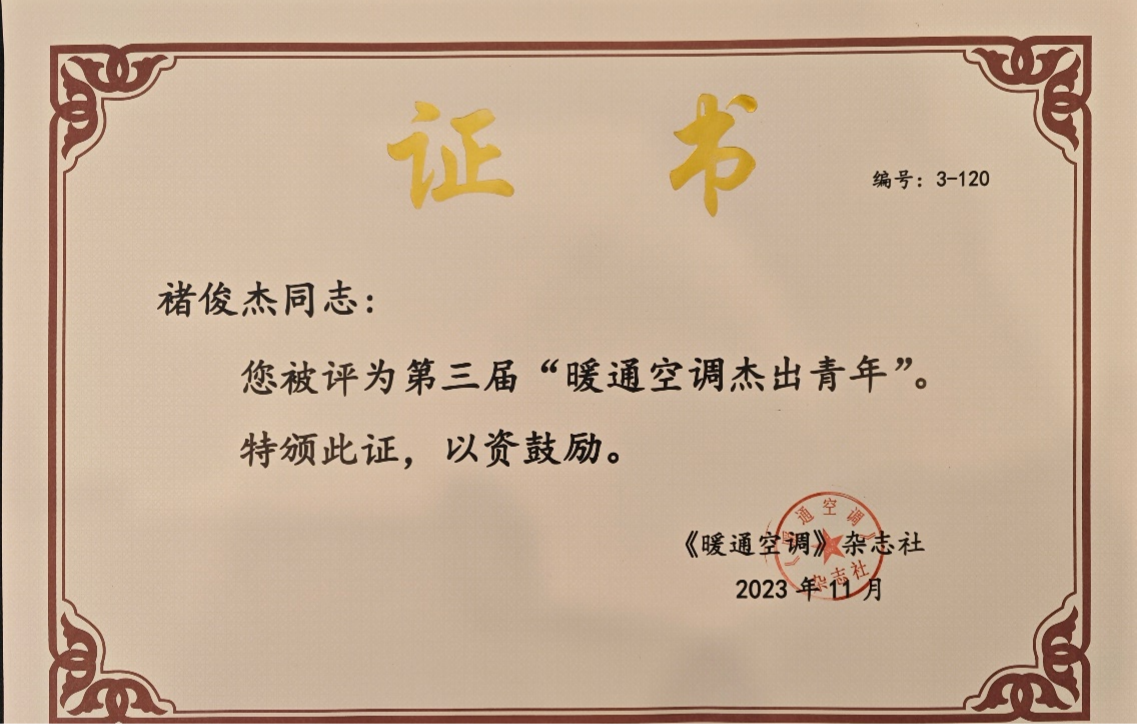 球王会官网教师褚俊杰荣获第三届“暖通空调杰出青年”荣誉称号