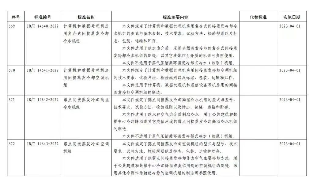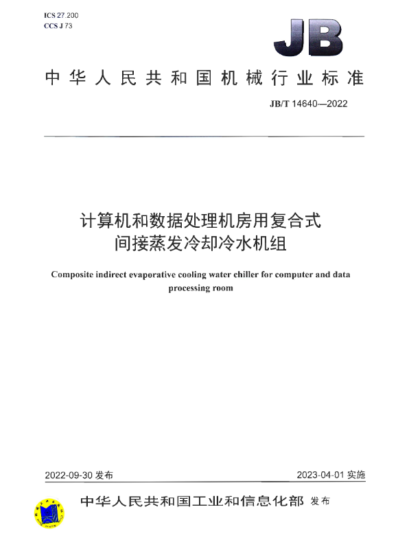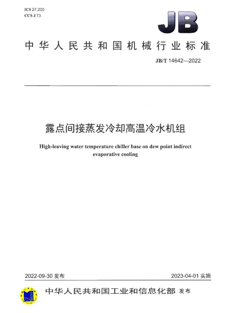《露点间接蒸发冷却高温冷水机组》(JB/T 14642-2022)规定了露点间接蒸发冷却高温冷水机组的型式与型号、技术要求、试验方法、检验规则以及标志、包装、运输和贮存。该标准适用于以水和空气为介质制取冷水,用于公共建筑和数据中心冷却降温或其它类似用途的露点间接蒸发冷却高温冷水机组的制造。