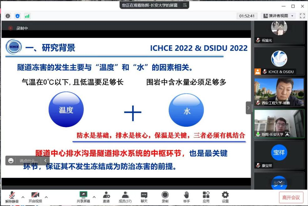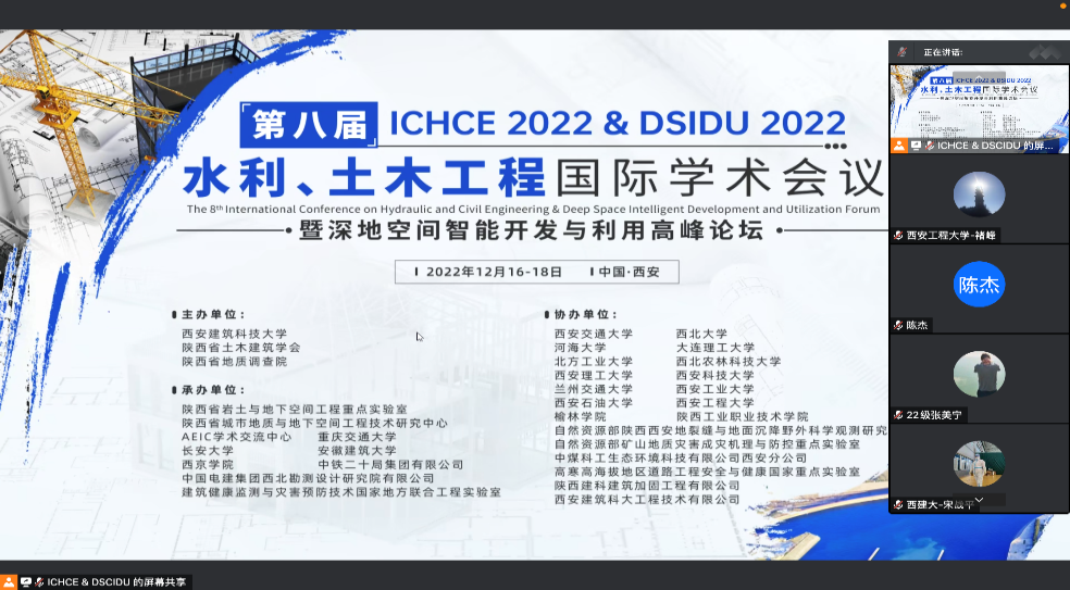2022年12月17日、18日,由西安建筑科技大学主办的第八届水利、土木工程国际学术会议暨深地空间智能开发与利用高峰论坛(ICHCE 2022 & DSIDU 2022)在线上举行,球王会体育土木工程系褚峰副教授受邀主持会议分会场,学院土木工程专业的部分研究生、本科生参加了本次会议。