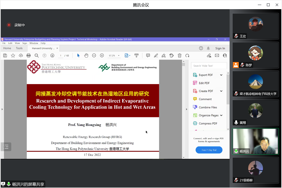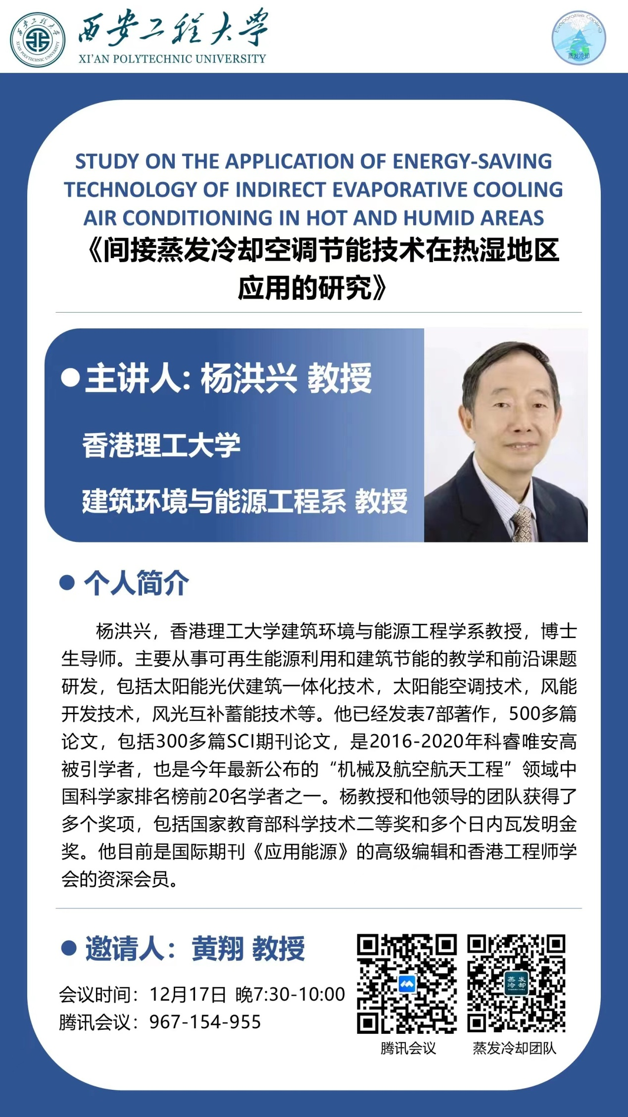 2022年12月17日,香港理工大学建筑环境与能源工程学系杨洪兴教授受球王会体育邀请,为学院师生做了题为《间接蒸发冷却空调节能技术在热湿地区应用的研究》的线上报告。报告由黄翔教授主持,学院相关专业师生近100人参加了报告会。