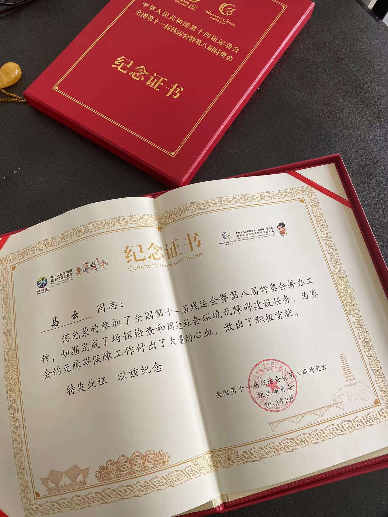 全国第十一届残运会暨第八届特奥会于2021年10月在西安举行,球王会体育官方网站临潼校区文体馆是比赛场馆之一。马云教授作为专家被聘为全国第十一届残运会暨第八届特奥会无障碍专家指导委员会委员,参加了两会的筹办工作,为赛事的无障碍保障工作做出了积极贡献。据悉,同时被颁发纪念证书的还有其他15位省内外专家。