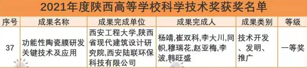2021年1月29日,2021年度陕西高等学校科学技术奖评审结果出炉,球王会官网杨靖教授、李波老师申报的《功能性陶瓷膜研发关键技术及应用》获一等奖。