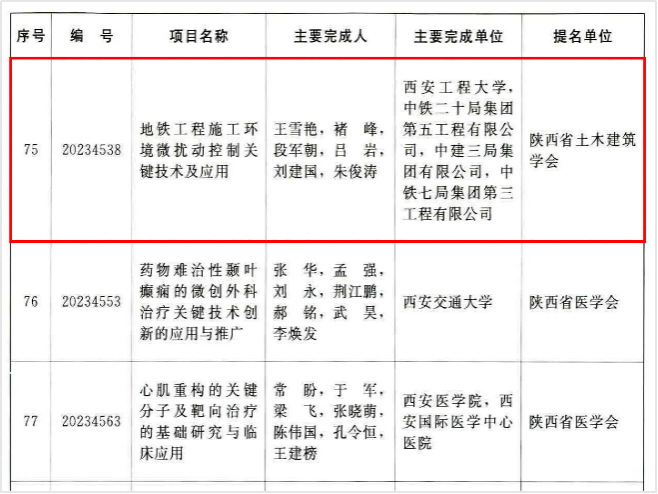 近日,陕西省人民政府发布了“陕西省人民政府关于2023年度陕西省科学技术奖励的决定”,以球王会体育官方网站为第一完成单位,球王会体育王雪艳老师、褚峰老师为第一、第二完成人的项目《地铁工程施工环境微扰动控制关键技术及应用》荣获三等奖!