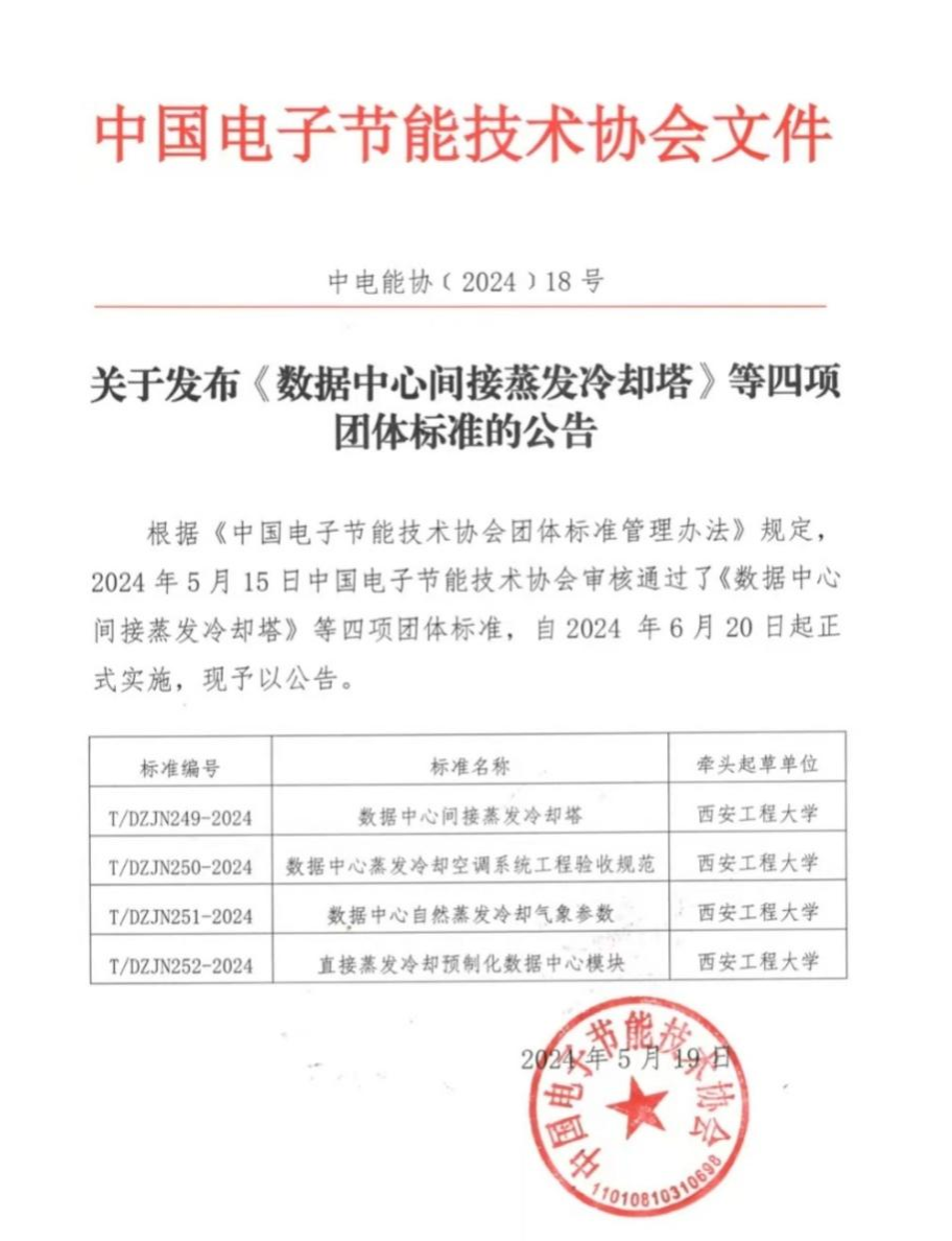 由球王会体育官方网站作为标准牵头单位,球王会体育黄翔教授作为标准编制组组长主编的《数据中心间接蒸发冷却塔》《数据中心蒸发冷却空调系统工程验收规范》《数据中心自然蒸发冷却气象参数》《直接蒸发冷却预制化数据中心模块》4项团体标准于2024年5月15日经中国电子节能技术协会审核通过,将自2024年6月20日起正式实施!