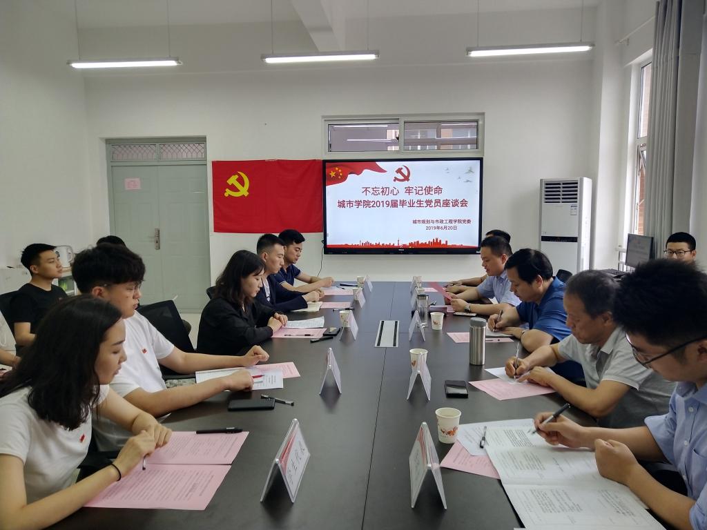 6月20日下午,球王会体育在8#301会议室召开“不忘初心、牢记使命”2019届毕业生党员座谈会。参加会议的有学院党委书记杨友谊、市政系主任张建民、学生工作办公室主任凌旭、15级辅导员陆瑞成、16级辅导员王春元及研究生、本科生毕业生党员代表和15级本科毕业生党员代表。会议由凌旭主持。