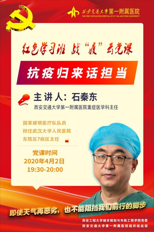 石秦东教授,中共党员,西安交通大学第一附属医院重症医学科主任,援鄂医疗队队员、援鄂期间担任武汉大学人民医院东院区7病区主任。曾参加过多次医疗救援工作,也是援疆干部。曾被新疆维吾尔自治区党委、人民政府授予“优秀援疆干部”的光荣称号。在这次的援鄂抗疫工作中,石教授再次表现出了一名医者的担当与仁爱。