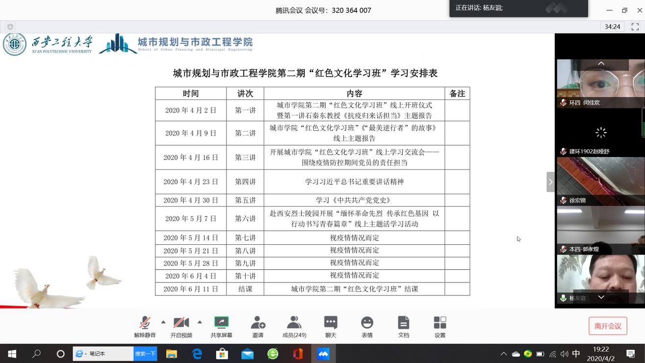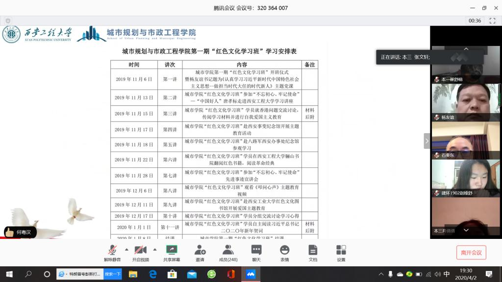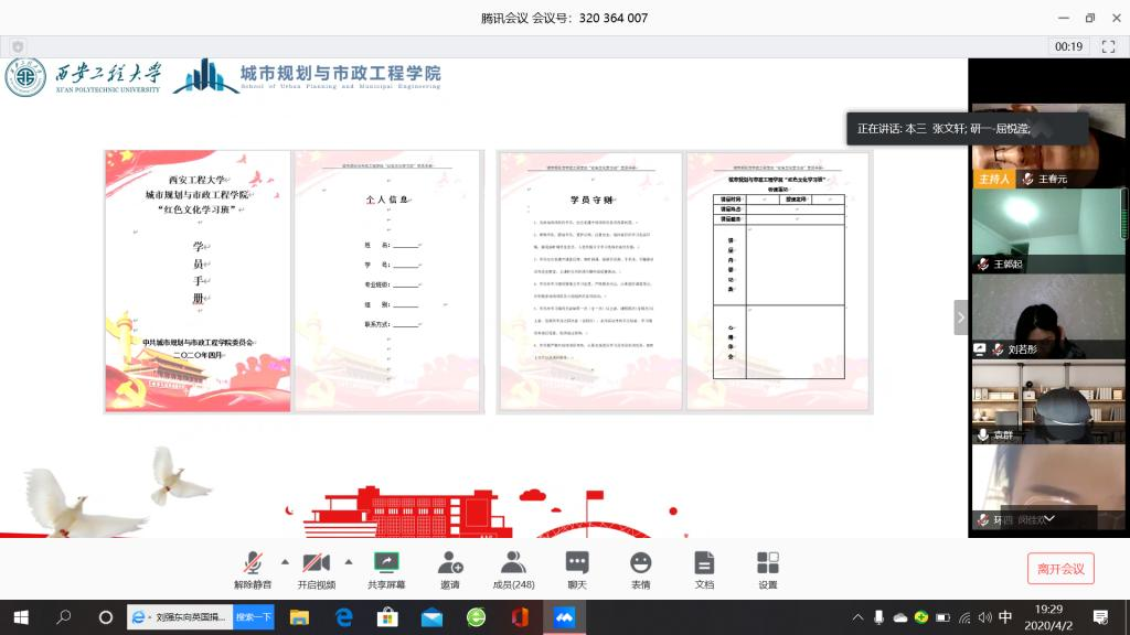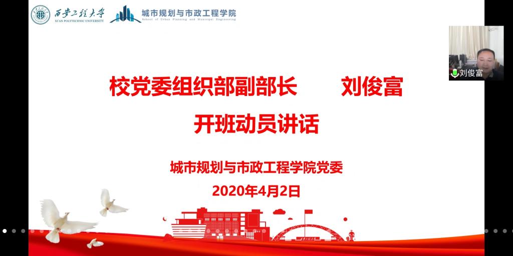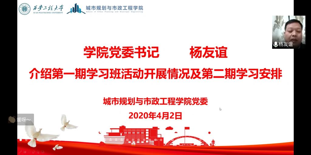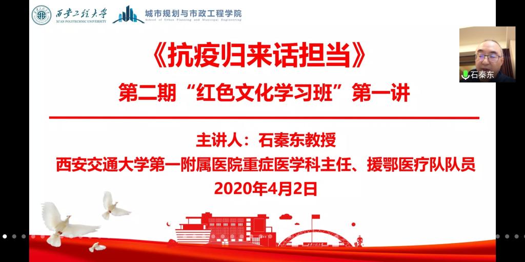 为加强大学生党员的理想信念教育,传承红色基因,锻造红色校园文化,培养大学生党员的责任与担当,落实立德树人根本任务。2020年4月2日晚19时,球王会体育第二期“红色文化学习班”线上开班仪式顺利举行,并邀请西安交通大学第一附属医院、援鄂医疗队队员石秦东教授做第一讲。参加开班仪式的有校党委组织部副部长刘俊富、校党委宣传部副部长戴新、学院党委书记杨友谊、学工办主任凌旭、学院全体支部书记和辅导员、第二期学习班学员、学院全体学生党员及团学干部。会议由学院党委副书记袁群主持。