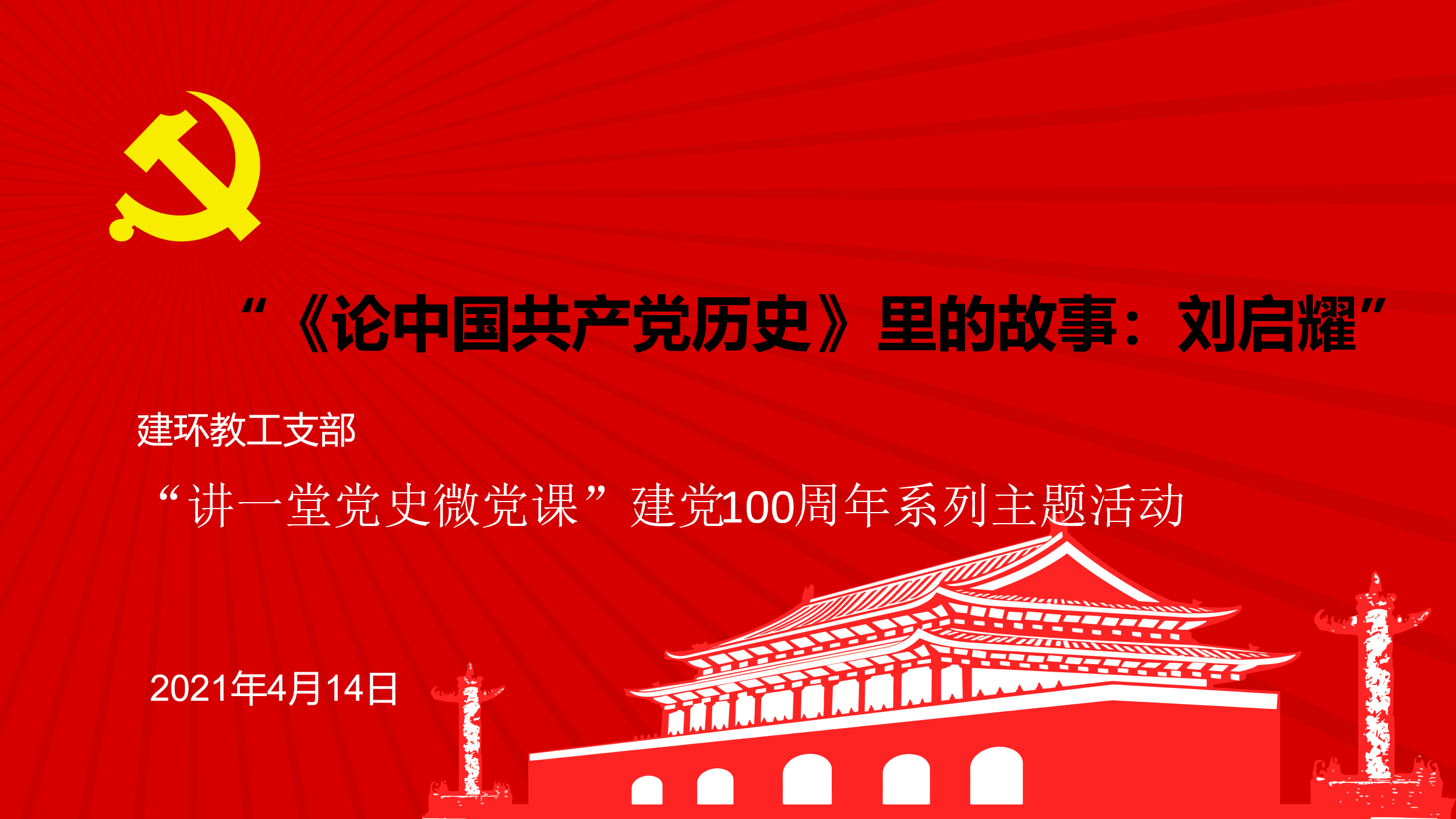 活动采取微课的方式,建环支部书记赵娟同志带领支部党员回忆了关于“刘启耀”的故事。“为官不贪、清政廉洁、克己奉公、顾全大局”,是他一生品格的真实写照。2021年春季学期中央党校(国家行政学院)中青年干部培训班在中央党校开班,习近平在开班式上发表重要讲话。习近平强调,对党忠诚,必须一心一意、一以贯之,必须表里如一、知行合一,任何时候任何情况下,都不改其心、不移其志、不毁其节。中国共产党建党百年来,党员队伍中有很多,对党忠诚、一心一意的人,“腰缠万贯的讨米人”刘启耀就是其中之一。