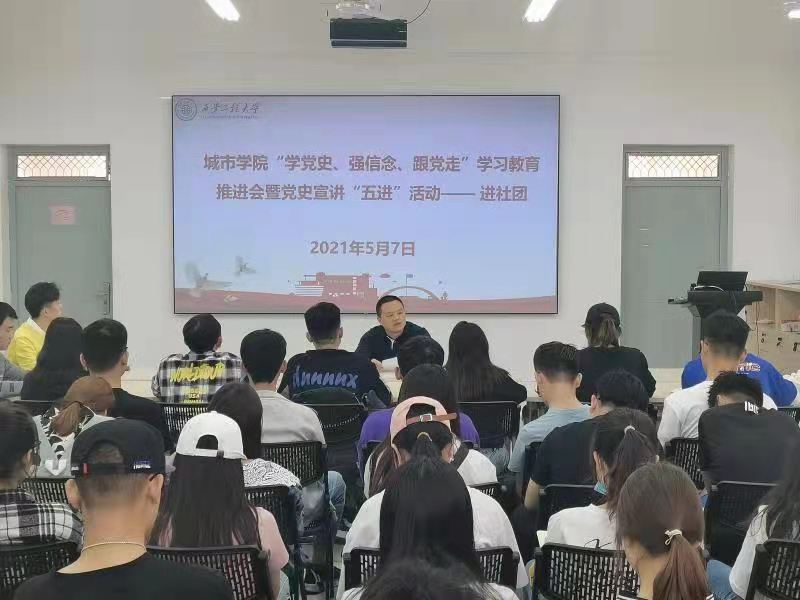 5月7日中午,球王会体育在临潼校区8-322会议室召开“学党史、强信念、跟党走”学习教育推进会暨党史宣讲“五进”活动——进社团宣讲会,学院学工办主任、团总支书记凌旭以及学生组织各部门负责人参加活动。