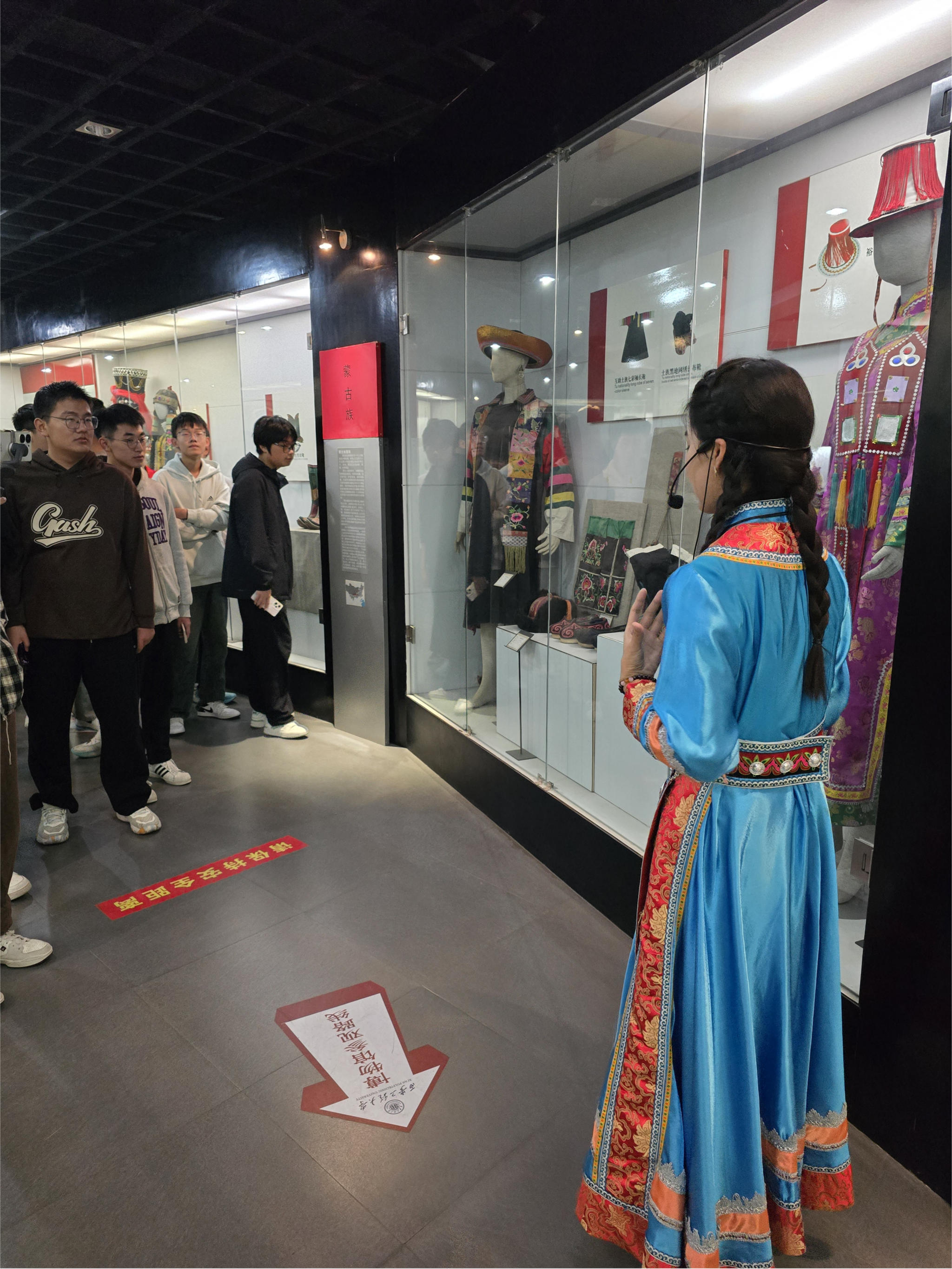 接下来,在蒙古族的展柜,蒙古族讲解员纺织学院张旗同学向同学们介绍了蒙古族的帽子、皮质烟袋以及蒙古族女子的传统服饰。同时,讲解员也向同学们介绍了她们衣服前面发套是用来装束头发,以便骑马和劳作。