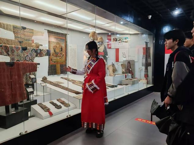 乌孜别克族讲解员城市学院赵志聪同学,接引参观学生,引导学生参观了蒙古族展柜、乌孜别克族展柜,以及重点展品。如:凤穿牡丹、蟒袍、印花模具等等。