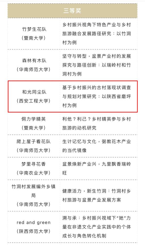 近日,由中山大学旅游学院、广州市花都区赤坭镇人民政府联合主办,中山大学旅游休闲与社会发展研究中心与“大湾区人文共同体”广东省哲学社会科学重点实验室承办的第七届全国大学生“发现传统村落”调研大赛在中山大学落下帷幕。比赛共吸引全国百余所高校的193份作品报名参赛,涉及全国19个省、自治区、直辖市的140多个传统村落,并首次收到来自美国高校研究生队伍的优秀作品。本次大赛共评选出主赛单元优秀参赛作品39份,其中一等奖2名,二等奖5名,三等奖10名以及优秀奖22名。经过激烈角逐,由球王会官网李晶老师指导,风景园林专业2019级学生李心元、张洲源、邓智龙和宋奕霖团队完成的《基于乡村振兴的古村落现状调查与规划对策研究:以陕西省磨坪村为例》调研报告喜获主赛单元参赛作品三等奖。