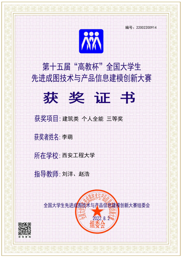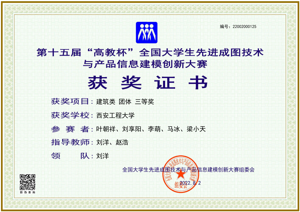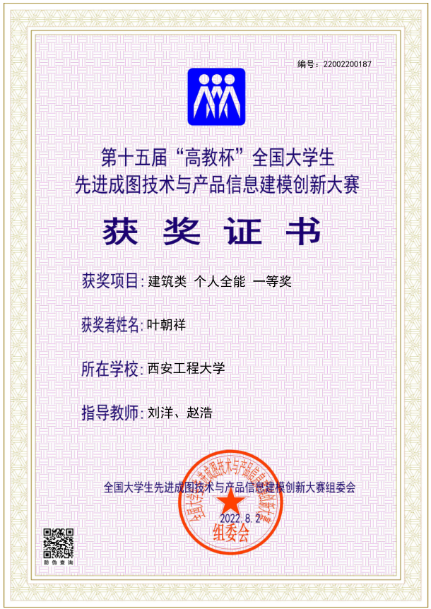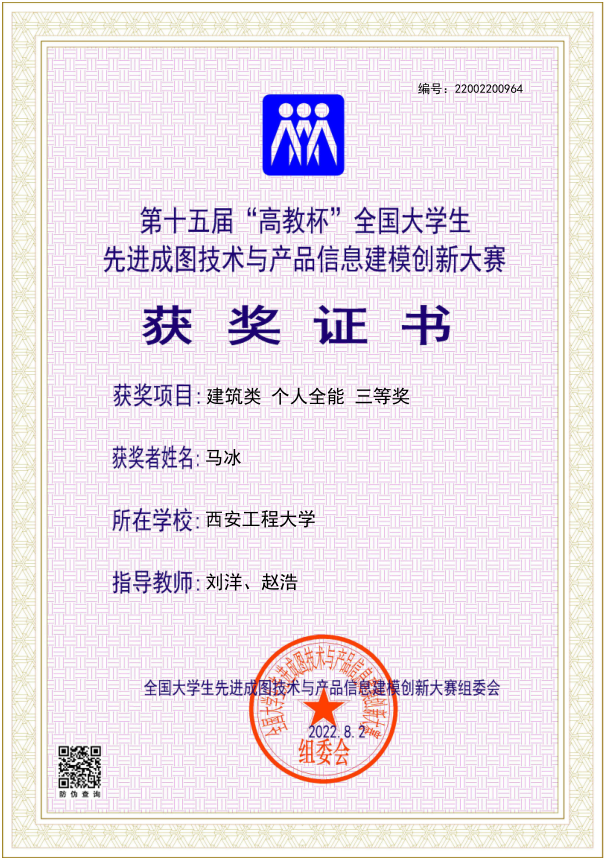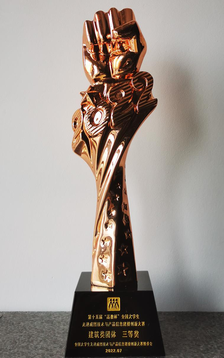 在总结交流省级选拔赛的经验后,经过队内推荐与协调,由我校球王会体育19级学生叶朝祥、刘享阳、马冰和21级学生李萌、梁小天组成球王会体育官方网站团队,在指导教师的带领下通过暑期居家训练,线上培训与交流,共克困难,积极备赛。最终代表球王会体育官方网站获得第十五届全国大学生先进成图技术与产品信息建模创新大赛建筑类团体三等奖的优异成绩,在建筑类个人全能赛项中叶朝祥获一等奖,刘享阳获二等奖,马冰、李萌、梁小天获三等奖。