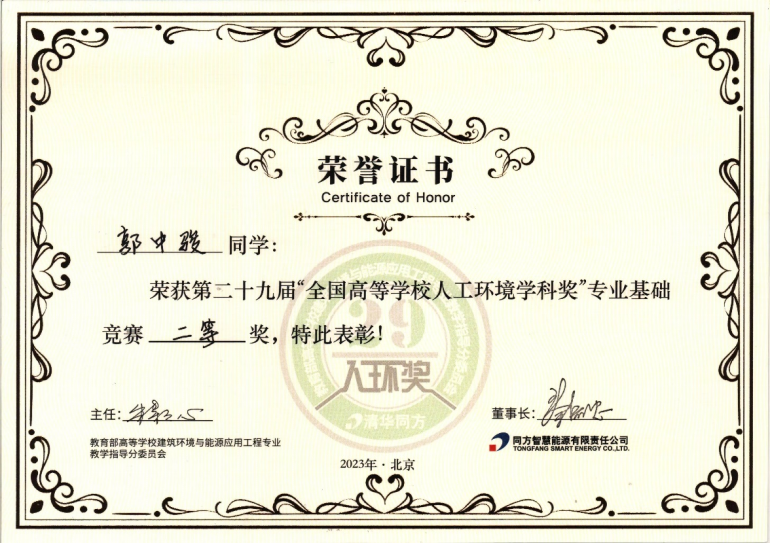 2023年8月25日,“领袖行业•主导未来”第29届“全国高等学校人工环境学科奖”专业基础竞赛颁奖典礼在北京清华同方科技大厦隆重举行。我校城市学院建筑环境与能源应用工程专业郭中骏同学荣获全国二等奖,在本项赛事中取得我校近年来的最好成绩!