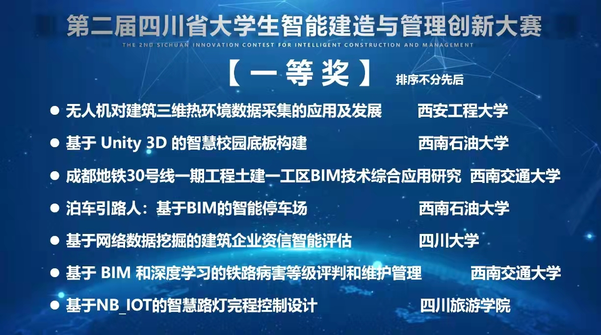 第二届四川省大学生智能建造与管理创新大赛总决赛在网上举行,大赛是以培养大学生的创新思维、科研能力、团队精神,以及增强大学生工程管理与实践能力为目的。经初赛遴选和复赛44位专家网络评审,最终有39支队伍进入决赛。受疫情影响,决赛39支参赛队伍分为4个分会场在线上进行答辩。决赛邀请了来自重庆大学、长安大学、北京航空航天大学、湖南大学等高校知名学者和来自四川省土木建筑学会、华西工程科技(深圳)股份有限公司、鲁班软件股份有限公司、广联达科技股份有限公司等行业专家对作品进行评审,决出一等奖7个、二等奖13个、三等奖19个。