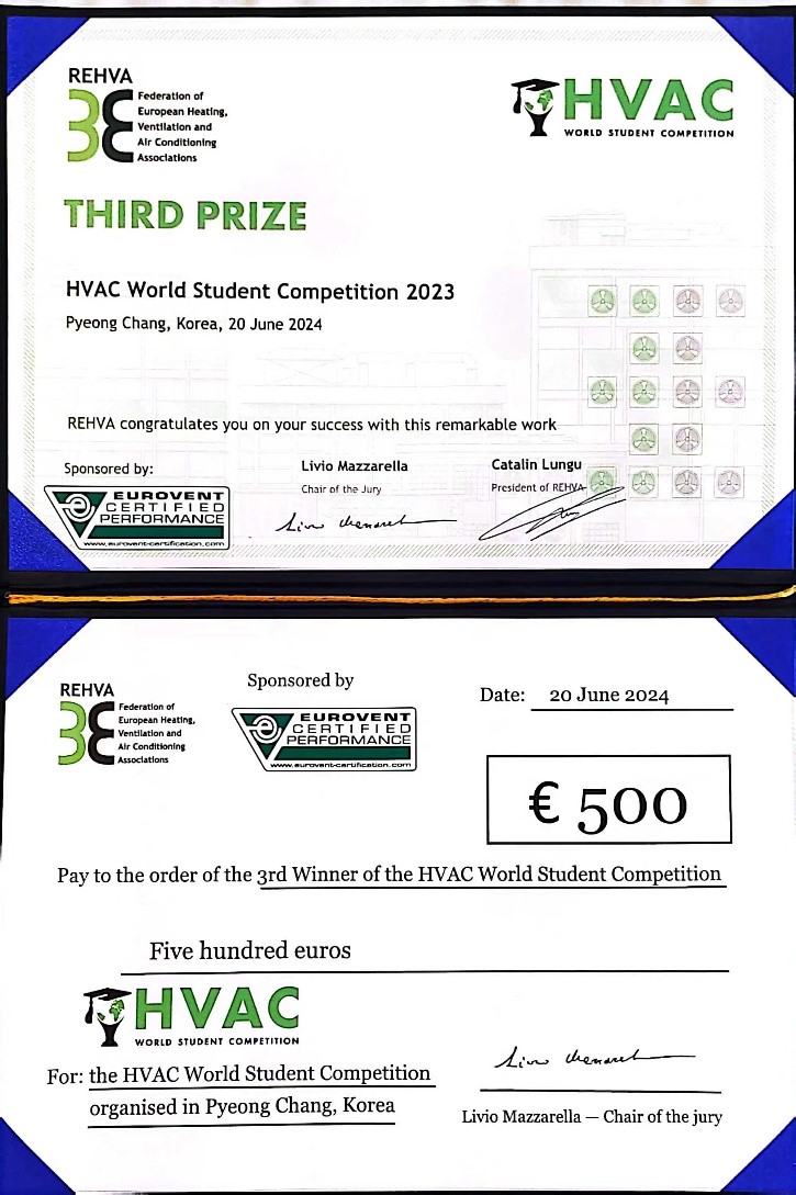 韩国当地时间2024年6月20日下午13时,北京时间6月20日中午12时,第七届世界暖通空调学生科技竞赛(HWSC,HVAC World Student Competition)在韩国平昌召开。由我国暖通空调产业技术创新联盟CAHVAC推荐的中国代表,“天加杯”一等奖获奖者、球王会体育官方网站城市学院黄翔教授指导的研究生赵娅舒和蒋苏贤同学,在竞赛中表现突出,最终荣获季军。