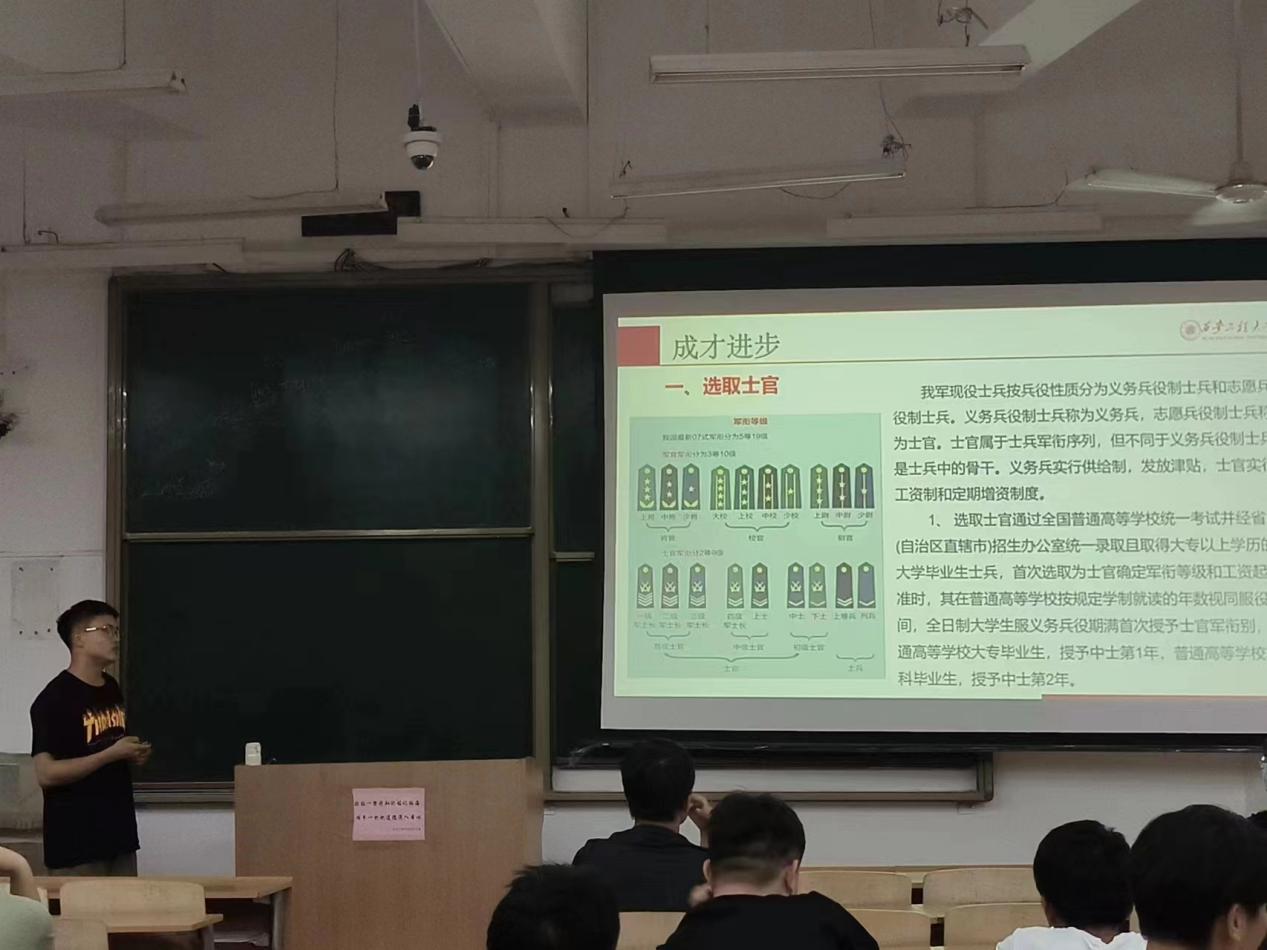 其次,宣讲人全面讲解了入伍的相关条件,如身体素质、年龄、学历、政治面貌等,宣讲了入伍保障、部队发展、退役安置等一系列优惠政策,使同学们对应征入伍有了全面认识。