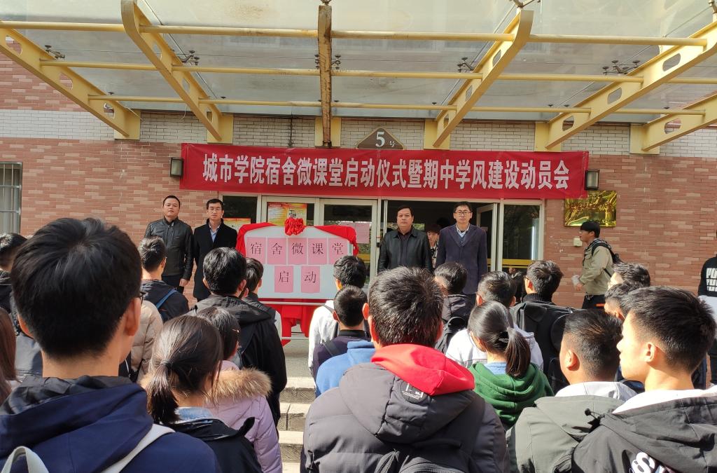 11月15日中午,城市学院在临潼校区5号公寓楼前举行“宿舍微课堂”启动仪式暨期中学风建设动员会。校党委学工部副部长杨建军、学院党委书记杨友谊、副院长房平、学工办主任凌旭、辅导员陆瑞成以及2019级各班学生干部、宿舍长参加活动。活动由陆瑞成主持。